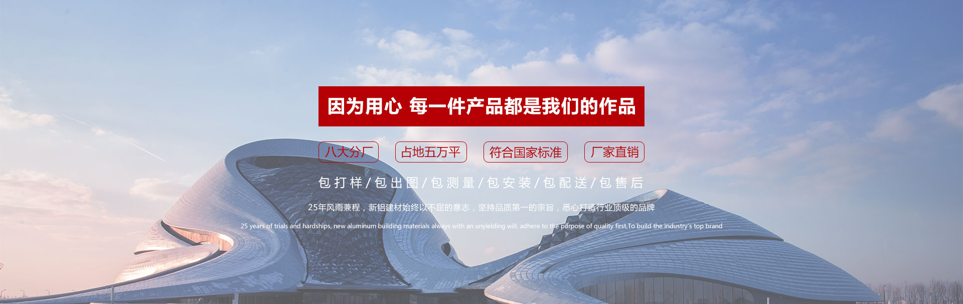 廣東新鋁裝飾材料有限公司是一家專業生產室內外金屬鋁單板、鋁天花板、鋁蜂窩板、鋁窗花、弧形鋁方通、仿大理石板、仿木紋板、瓦楞板及鋁型材加工噴涂的現代化企業,有著10多年研發、生產、銷售、安裝一條龍服務的集團公司。公司擁有先進的數控鈑金加工設備,配備了日本蘭氏全自動靜電氟碳涂線、數控沖床、數控剪板機、數控折彎機及全自動真空吸塑熱轉印機、數控熱壓機等多套先進的高精度的幕墻產品生產加工設備。廣東新鋁裝飾材料有限公司秉承“以人為本、科技為先”的經驗理念,堅持規?;\作,規范化經營的發展思路,建立了完善的營銷網絡及高素質的銷售隊伍,擁有一支豐富經驗的設計團隊,專門配合建筑裝飾材料的深化設計及工藝構思,品牌精益求精理念,高品位的產品、良好的質量、精湛的工藝,豐富齊全的產品、安全可靠的質量和專業完善的服務系統享譽于行業!